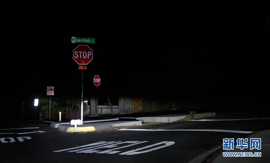 10月28日,在美國加利福尼亞州舊金山灣區的雷德伍德城,山區的一處居民區停電。 為防范強風刮斷電線引燃山林,加州主要的電力企業太平洋天然氣和電氣公司26日下午開始在加州北部實行預防性斷電措施,涉及36個縣約94萬用戶用電。 新華社記者吳曉凌 攝