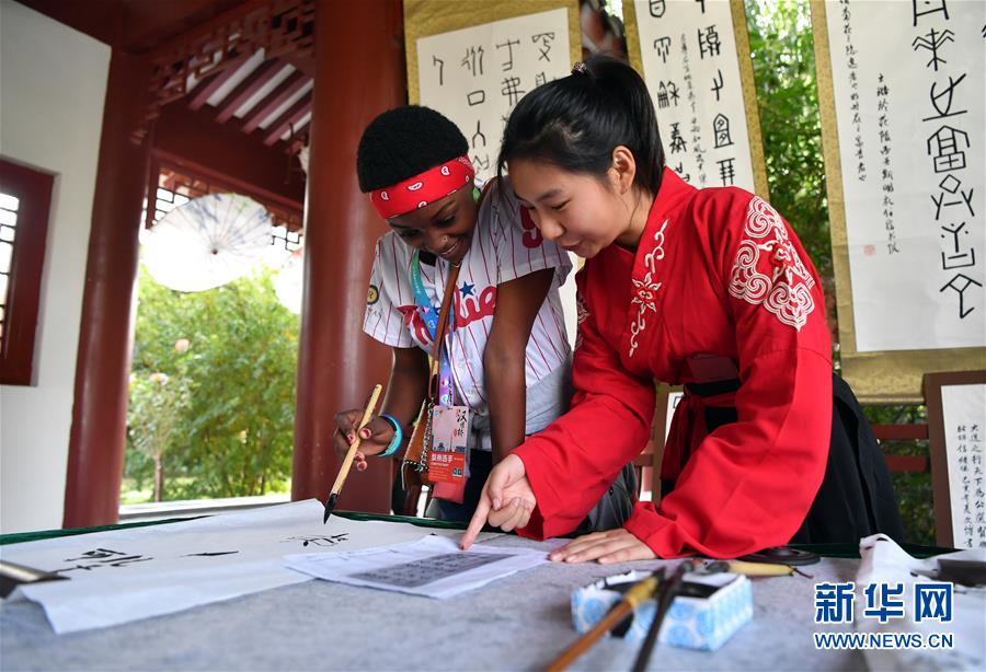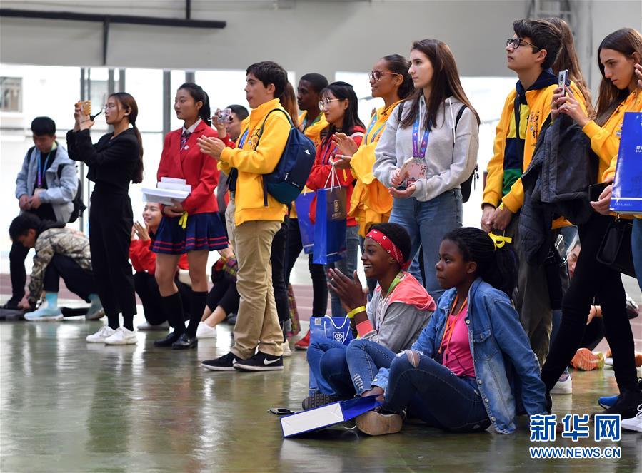 拉一莎在第十二屆“漢語(yǔ)橋”世界中學(xué)生中文比賽才藝展示前與朋友互動(dòng)(10月24日攝)。新華社記者 李嘉南 攝