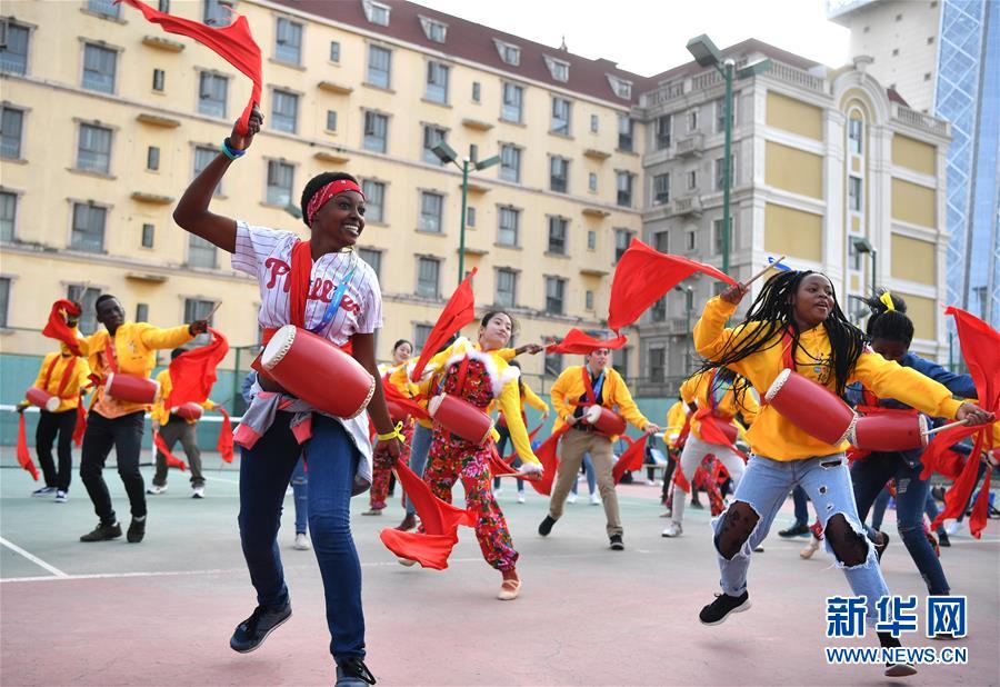 拉一莎(前左)在鄭州西亞斯學(xué)院體驗(yàn)打腰鼓(10月28日攝)。新華社記者 李嘉南 攝