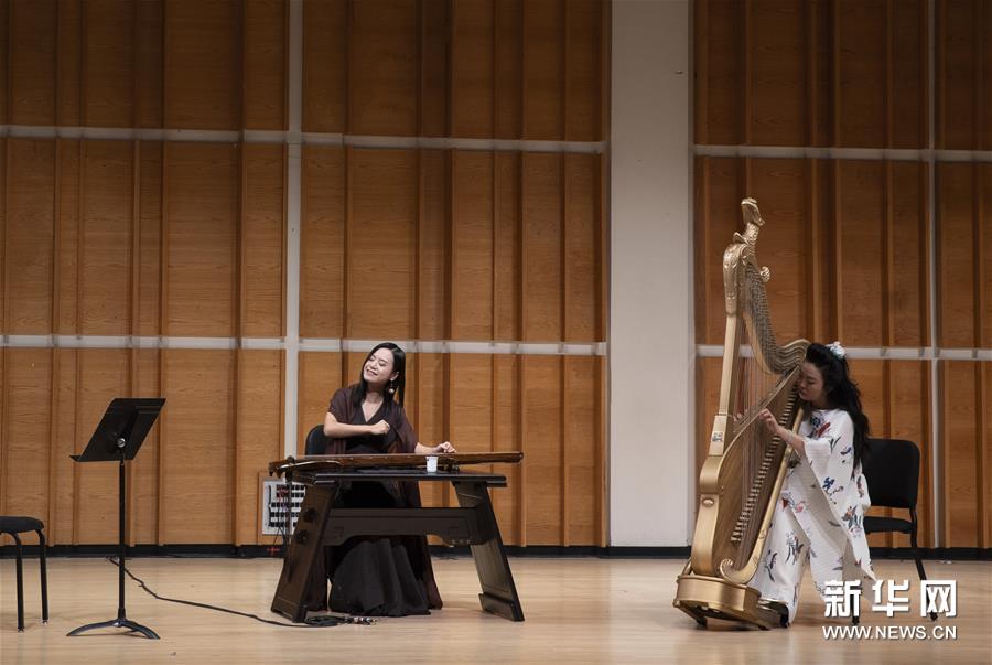 11月10日,中國古琴歌音樂家何怡(左)在美國紐約考夫曼音樂中心演出。新華社發(fā)(林經(jīng)宇攝)