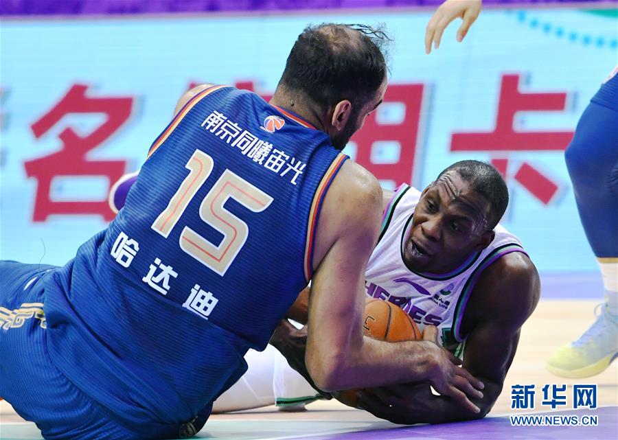 12月3日,南京同曦宙光隊球員哈達迪(左)和山東西王隊球員哈德森在比賽中爭球。 當日,在2019-2020賽季中國男子籃球職業聯賽(CBA)常規賽第13輪比賽中,山東西王隊主場對陣南京同曦宙光隊。 新華社記者吳魯攝