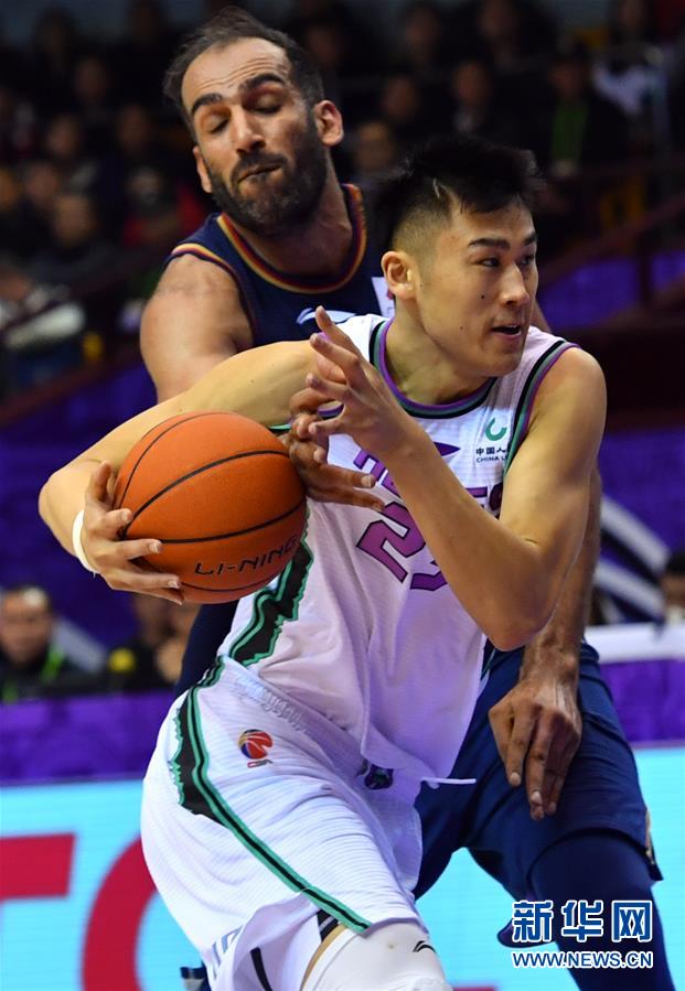 12月3日,山東西王隊球員賈誠(前)突破南京同曦宙光隊球員哈達迪的防守。 當日,在2019-2020賽季中國男子籃球職業聯賽(CBA)常規賽第13輪比賽中,山東西王隊主場以132比122戰勝南京同曦宙光隊。 新華社記者朱崢攝