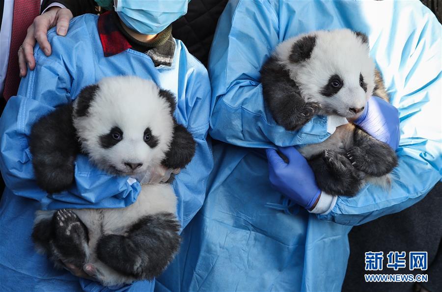 12月9日,在德國柏林動物園,工作人員抱起大熊貓雙胞胎“夢想”(右)與“夢圓”。 在德國柏林動物園出生百天的大熊貓雙胞胎9日被正式命名為“夢想”“夢圓”。 新華記者 單宇琦 攝