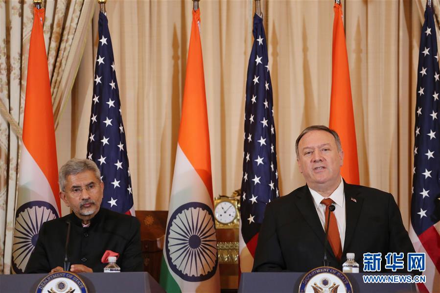 12月18日,在美國華盛頓,美國國務(wù)卿蓬佩奧(右)和印度外長蘇杰生出席聯(lián)合記者會。 美國、印度兩國外長和防長18日在華盛頓舉行“2+2”對話會,雙方達(dá)成了一系列協(xié)定并重申加強(qiáng)戰(zhàn)略伙伴關(guān)系。 新華社記者 檀易曉 攝