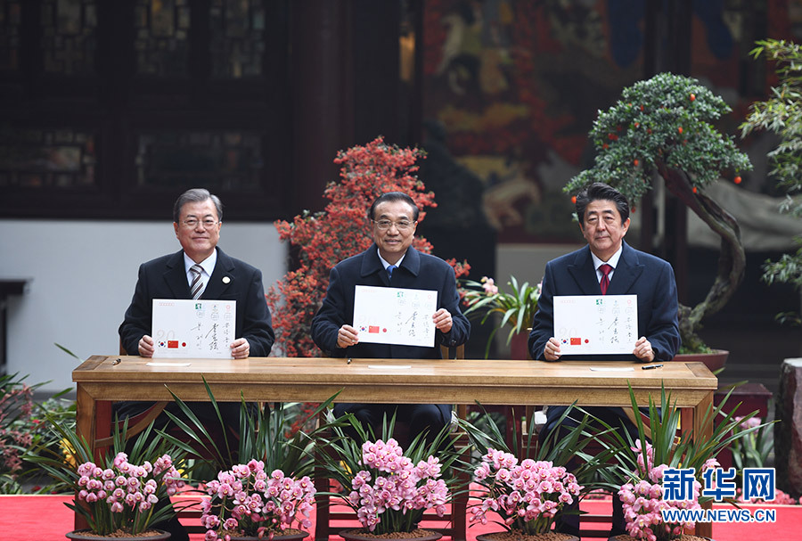 李克強與韓國總統(tǒng)文在寅、日本首相安倍晉三共同出席中日韓合作20周年紀念活動
