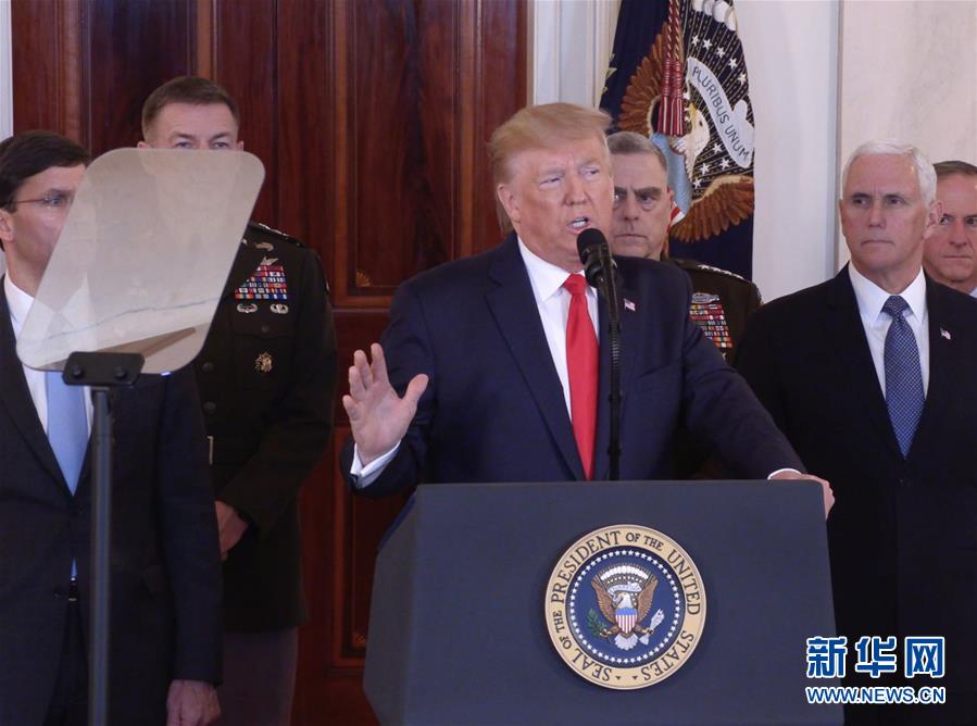 1月8日,美國總統特朗普(中)在華盛頓白宮發表電視講話。 美國總統特朗普8日說,伊朗對駐有美軍的伊拉克軍事基地發動的襲擊未造成美方人員傷亡,美方將立即對伊朗實施新的經濟制裁。 新華社記者 胡友松 攝