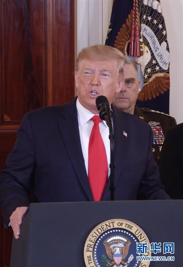 1月8日,美國總統特朗普(中)在華盛頓白宮發表電視講話。 美國總統特朗普8日說,伊朗對駐有美軍的伊拉克軍事基地發動的襲擊未造成美方人員傷亡,美方將立即對伊朗實施新的經濟制裁。 新華社記者 胡友松 攝
