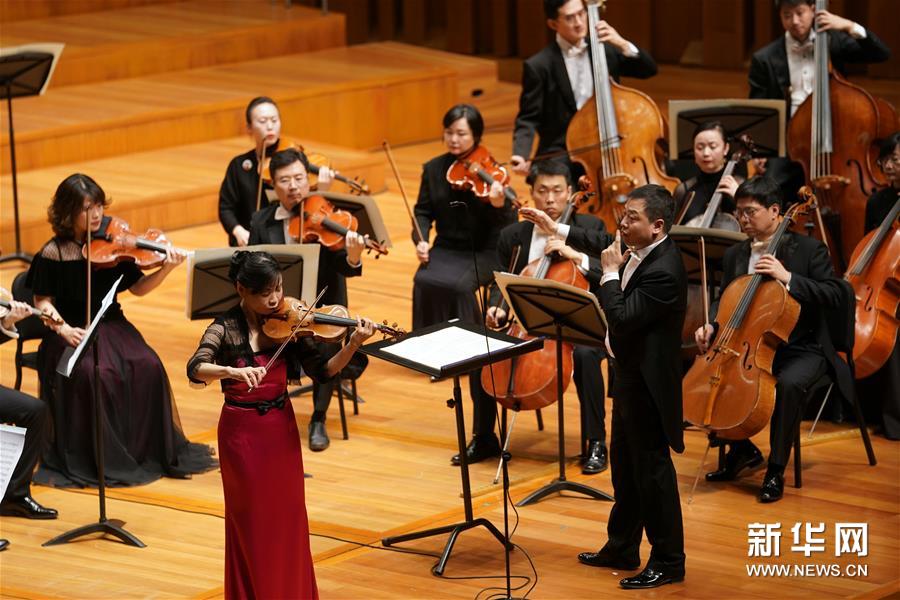 1月8日,指揮家張藝(前右)、小提琴演奏家黃濱(前左)在無詞版《帕西法爾》交響音樂會(huì)上演出。當(dāng)日,中國交響樂團(tuán)2019-2020音樂季演出之一——無詞版《帕西法爾》交響音樂會(huì)在北京國家大劇院上演。新華社記者 金良快 攝