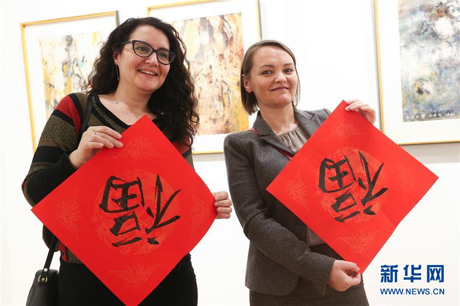 1月17日,觀眾在比利時布魯塞爾中國文化中心展示自己獲贈的書法作品。當日,“中國年·共歡樂”歡樂春節主題文化系列活動在比利時布魯塞爾中國文化中心開幕。歌舞演出、“敦煌詩意”繪畫作品展、書法體驗等活動吸引了眾多中外人士。新華社記者 鄭煥松 攝