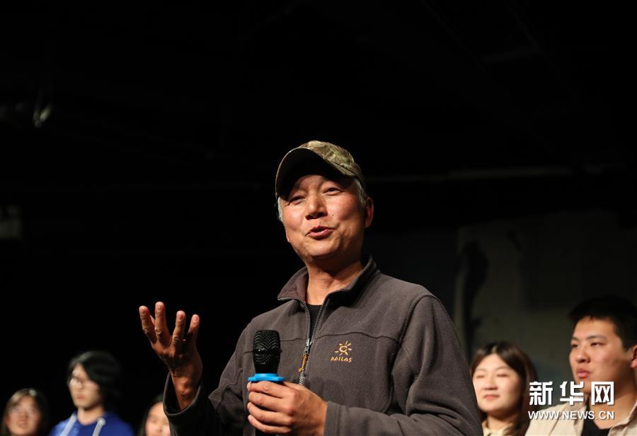1月14日,中國著名野生動物攝影師奚志農在演出結束后向演員致謝。新華社發(韓旭攝)