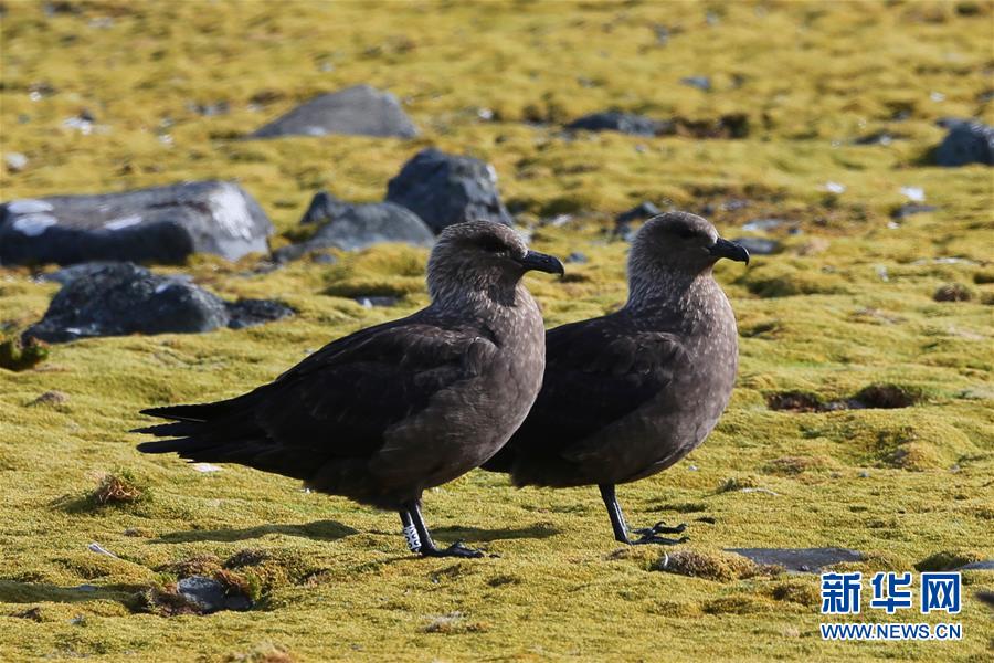 長(zhǎng)城站賊鷗湖邊苔蘚地上的兩只賊鷗(2月9日攝)。新華社記者 劉詩(shī)平 攝
