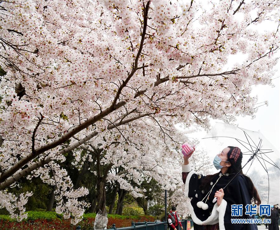 4月9日,市民游客在青島市中山公園櫻花大道上拍照。 進入四月,山東省青島市中山公園迎來櫻花期,櫻花大道兩側數千株單櫻、雙櫻次第開放,花團錦簇,燦若云霞。 新華社記者 李紫恒 攝