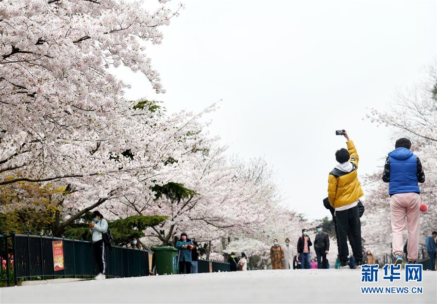 4月9日,市民游客在青島市中山公園櫻花大道上拍照。 進入四月,山東省青島市中山公園迎來櫻花期,櫻花大道兩側數千株單櫻、雙櫻次第開放,花團錦簇,燦若云霞。 新華社記者 李紫恒 攝
