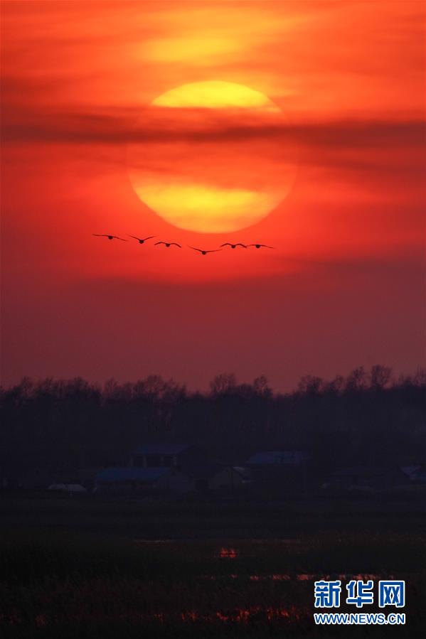 4月9日,在位于吉林省白城市鎮賚縣的莫莫格國家級自然保護區,候鳥從濕地上空飛過。 隨著氣溫回暖,位于吉林省白城市鎮賚縣境內的莫莫格國家級自然保護區迎來候鳥北歸高峰期。近兩千只白鶴,數萬只大雁、野鴨等在此停歇休養,補給覓食。 新華社記者 張楠 攝