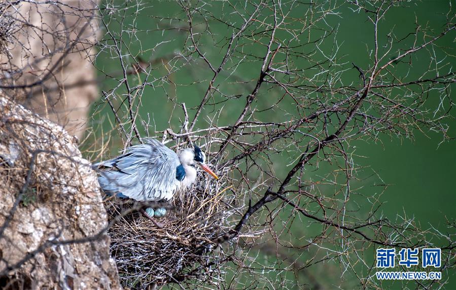 4月6日,一只蒼鷺在黃河岸邊的枝頭上孵蛋。 隨著氣溫轉暖,夏候鳥的“先頭部隊”蒼鷺陸續抵達山西平陸黃河濕地,它們在黃河岸邊筑巢、安家,成為春日里一道靚麗的風景線。 新華社記者 王飛航 攝