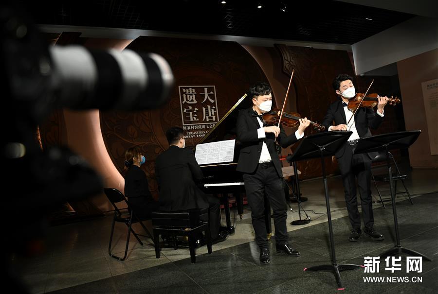 4月14日,西安交響樂團的十余位演奏家在陜西歷史博物館大唐遺寶展廳為即將于4月18日舉行的首場“云上國寶”音樂會進行彩排,這是西安交響樂團小提琴首席周虎翼(右)、第二小提琴首席白東旭(左)和鋼琴樂手程飛(中)在進行排練。新華社記者李一博攝
