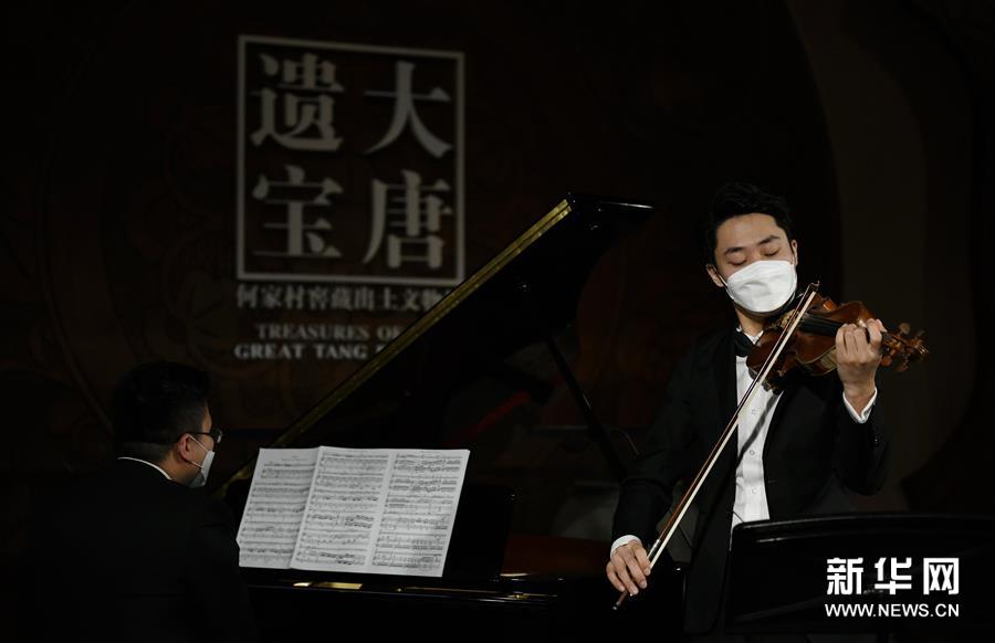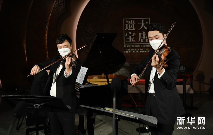 4月14日,西安交響樂團的十余位演奏家在陜西歷史博物館大唐遺寶展廳為即將于4月18日舉行的首場“云上國寶”音樂會進行彩排,這是西安交響樂團小提琴首席周虎翼(右)和第二小提琴首席白東旭在進行排練。新華社記者李一博攝