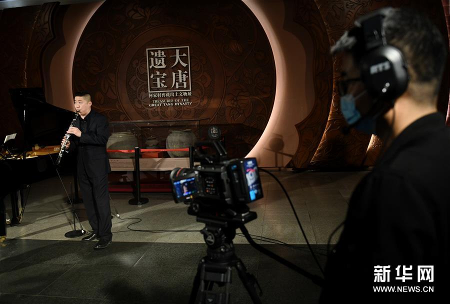 4月14日,西安交響樂團的十余位演奏家在陜西歷史博物館大唐遺寶展廳為即將于4月18日舉行的首場“云上國寶”音樂會進行彩排,這是西安交響樂團單簧管首席田天添(左)在進行排練。新華社記者李一博攝
