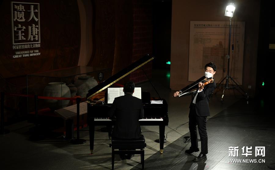 4月14日,西安交響樂團的十余位演奏家在陜西歷史博物館大唐遺寶展廳為即將于4月18日舉行的首場“云上國寶”音樂會進行彩排,這是西安交響樂團小提琴首席周虎翼(右)在進行排練。新華社記者李一博攝