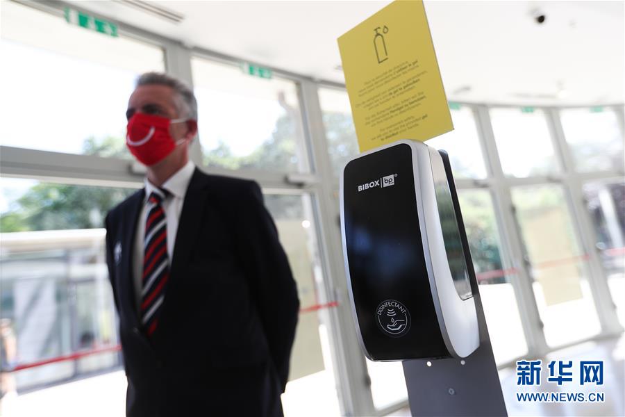 6月1日,在比利時(shí)布魯塞爾的原子球塔入口處,一名工作人員站在消毒洗手機(jī)旁迎候游客。 隨著比利時(shí)新冠疫情趨緩,比利時(shí)標(biāo)志性建筑——原子球塔當(dāng)日重新面對(duì)游客開放。 新華社記者 鄭煥松 攝