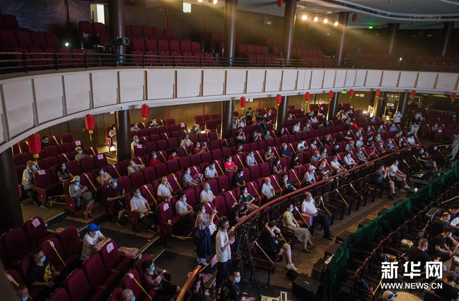 6月26日,市民在武漢市人民劇院觀看漢劇《狀元媒》。 當日,武漢市中心7家劇場恢復開放,各大文藝院團恢復線下演出,市民再次坐在劇場內(nèi)觀看“戲碼頭”上群星云集、百戲薈萃。 新華社記者 肖藝九 攝
