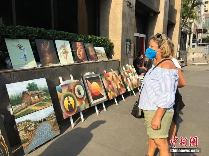 資料圖:疫情下的巴西圣保羅,商業重啟推進經濟逐漸恢復。圖為當地時間8月9日,巴西圣保羅街頭畫攤吸引行人駐足觀看。中新社記者 莫成雄 攝