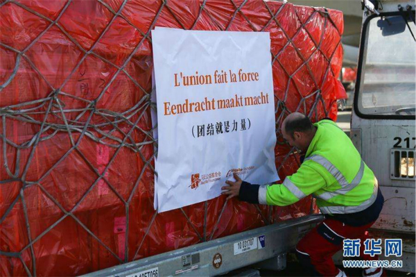 當地時間3月16日,來自中國的30萬只口罩運抵比利時列日機場。物資外包裝上印有中西兩種語言的“團結就是力量”。新華社記者 張鋮攝