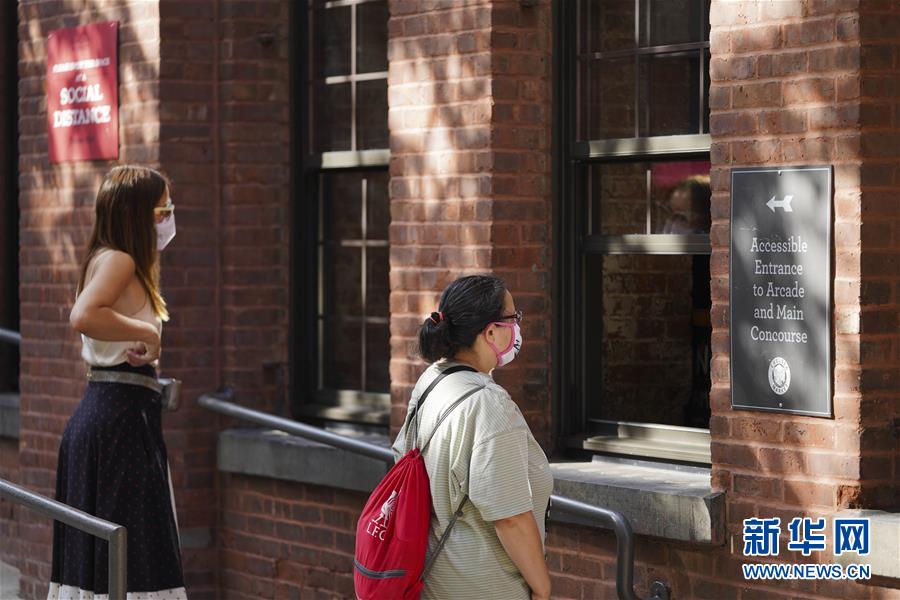 9月7日,人們在美國紐約的切爾西市場戶外餐區等待取餐。 位于紐約曼哈頓下城的切爾西市場是紐約著名的餐飲和購物地。受新冠疫情影響,目前該市場只有部分餐飲和零售店鋪恢復了營業,客流量也明顯下降。 新華社記者 王迎 攝