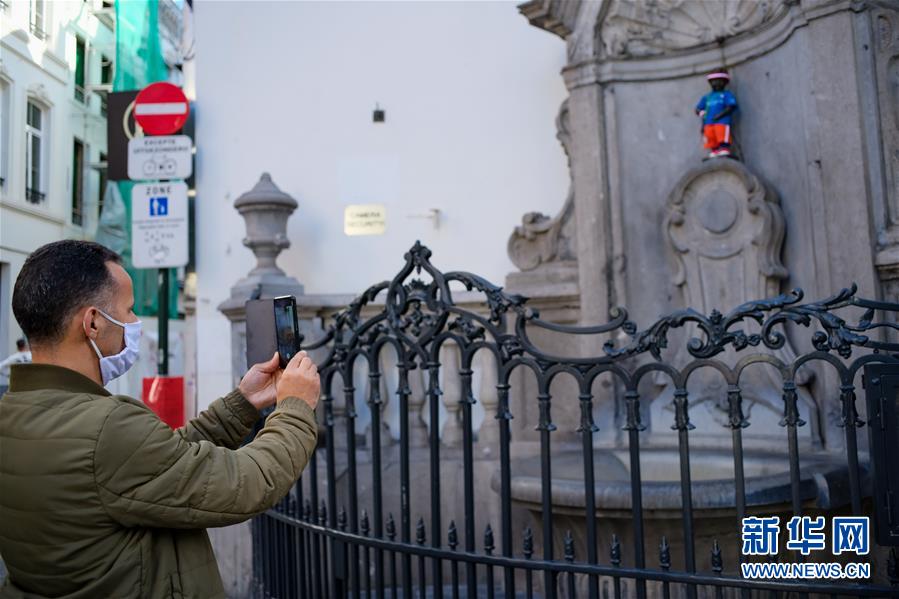 9月7日,一名游客在比利時布魯塞爾的“小尿童”雕像前拍照。 新華社記者 張鋮 攝