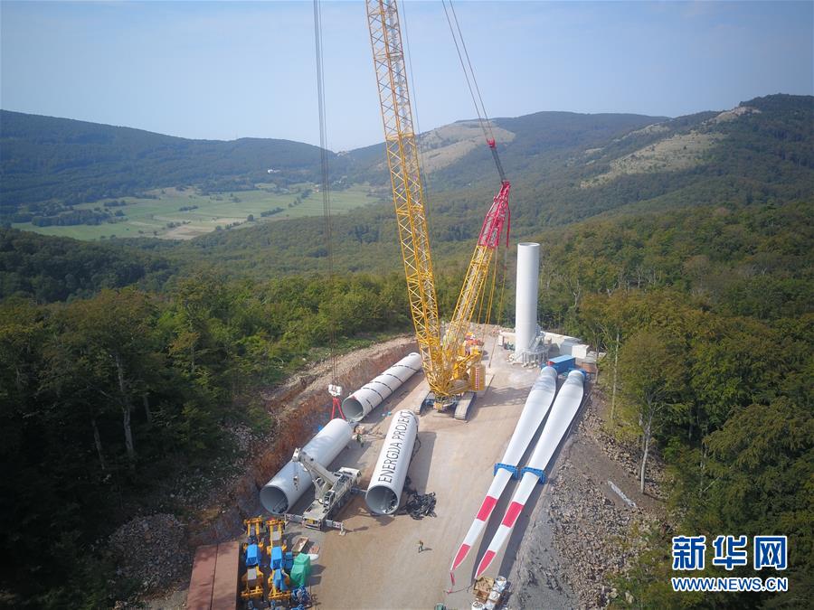 這是9月16日拍攝的克羅地亞塞尼風電項目風機塔筒吊裝施工現場。新華社記者 高磊 攝