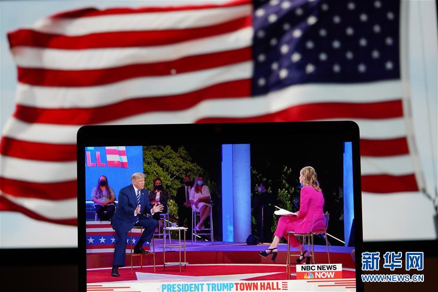 這張10月15日在美國弗吉尼亞州阿靈頓拍攝的照片顯示,電視上正在播放美國現任總統、共和黨總統候選人特朗普(左)在佛羅里達州邁阿密市參加選民問答會的節目。 美國現任總統、共和黨總統候選人特朗普和民主黨總統候選人、前美國副總統拜登15日晚分別在佛羅里達州邁阿密市和賓夕法尼亞州費城參加選民問答會。 新華社記者 劉杰 攝