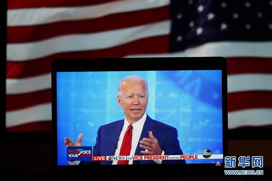 這張10月15日在美國弗吉尼亞州阿靈頓拍攝的照片顯示,電視上正在播放民主黨總統候選人、前美國副總統拜登在賓夕法尼亞州費城參加選民問答會的節目。 美國現任總統、共和黨總統候選人特朗普和民主黨總統候選人、前美國副總統拜登15日晚分別在佛羅里達州邁阿密市和賓夕法尼亞州費城參加選民問答會。 新華社記者 劉杰 攝