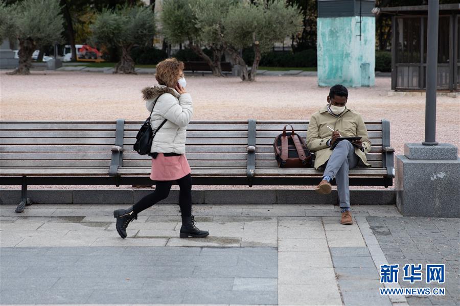 這是10月21日在西班牙馬德里哥倫布廣場上拍攝的佩戴口罩的人們。新華社記者 孟鼎博 攝