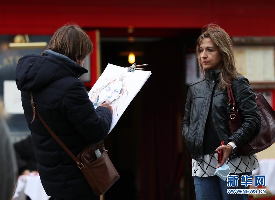 10月28日,在法國巴黎蒙馬特高地小丘廣場,一名街頭畫家為顧客作畫。 法國總統(tǒng)馬克龍28日在電視講話中宣布,為遏制新冠疫情蔓延,法國將從30日起再度全國“封城”。餐館、酒吧等非生活必需的營業(yè)場所將關(guān)閉,民眾的非必要出行將被禁止,大學(xué)將關(guān)閉并進(jìn)行網(wǎng)絡(luò)授課,政府鼓勵企業(yè)遠(yuǎn)程辦公。 新華社記者 高靜 攝
