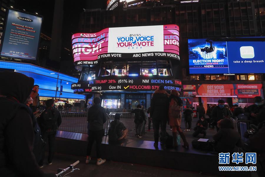 11月3日,人們在美國紐約時報廣場觀看實時計票結果。 2020年美國大選投票當地時間3日晚全部結束,并隨即開始計票。經過一夜等待,美國人未能等來誰將成為他們下一任總統的明確結果。根據初步計票和美國各大媒體測算,共和黨總統候選人、現任總統特朗普和民主黨總統候選人、前副總統拜登選情異常膠著,截至美國東部時間4日6時,兩人均暫未獲得當選總統所需的270張選舉人票。 新華社記者 王迎 攝