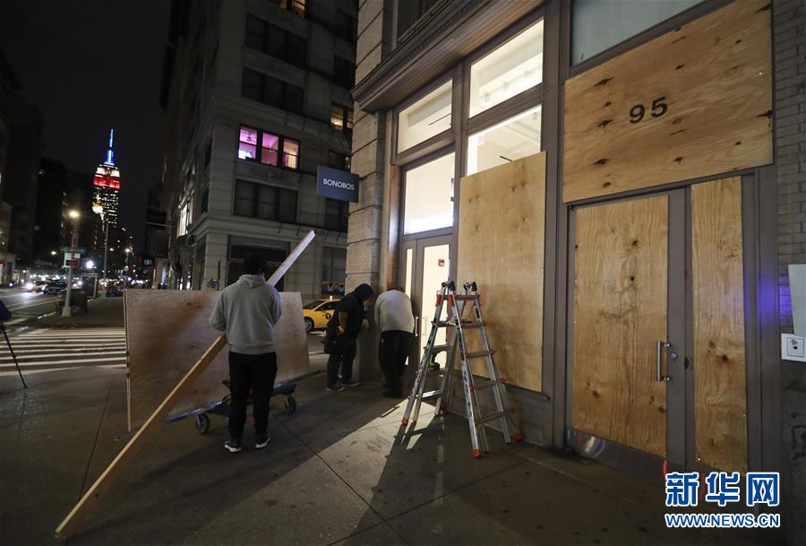 11月3日,工人為美國紐約一家商店安裝防護板。 2020年美國大選投票當地時間3日晚全部結束,并隨即開始計票。經過一夜等待,美國人未能等來誰將成為他們下一任總統的明確結果。根據初步計票和美國各大媒體測算,共和黨總統候選人、現任總統特朗普和民主黨總統候選人、前副總統拜登選情異常膠著,截至美國東部時間4日6時,兩人均暫未獲得當選總統所需的270張選舉人票。 新華社記者 王迎 攝