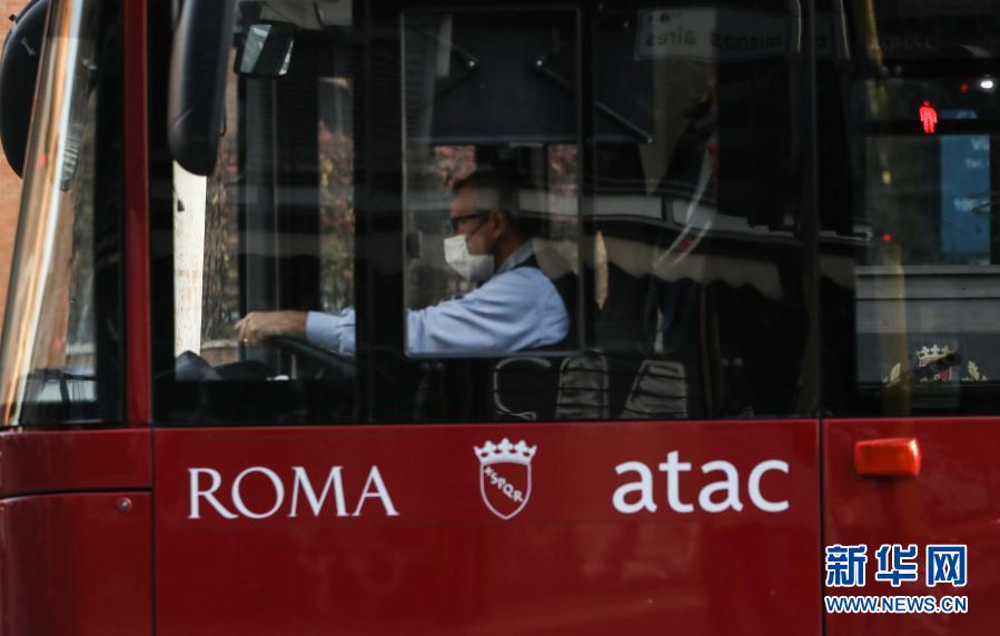 11月11日,在意大利首都羅馬,一名公交車司機戴著口罩工作。新華社記者程婷婷攝