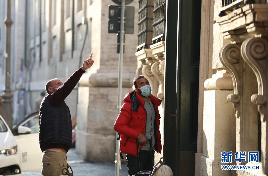 11月10日,在意大利首都羅馬,人們戴著口罩在街頭交談。新華社記者程婷婷攝