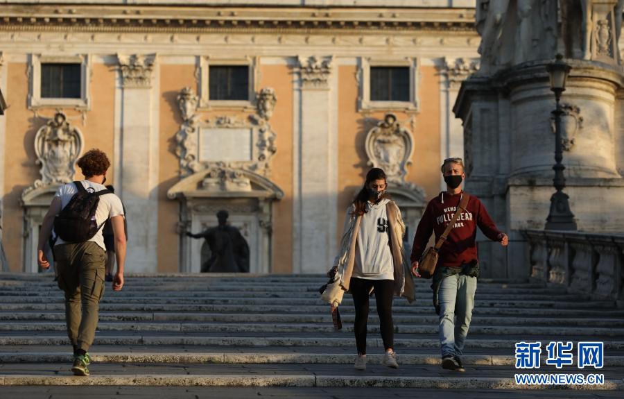 11月10日,在意大利首都羅馬,人們戴著口罩走在羅馬市政廳前。新華社記者程婷婷攝