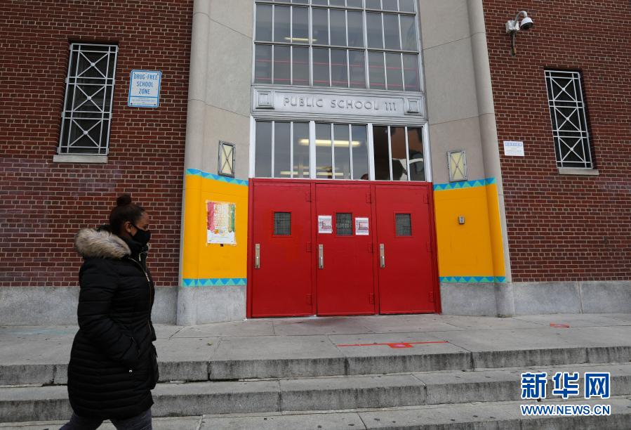 11月19日,在美國紐約,一名女子從一所公立學校外走過。紐約市長德布拉西奧18日宣布,紐約市公立學校19日起暫停線下授課,改為在線教學。新華社記者王迎攝