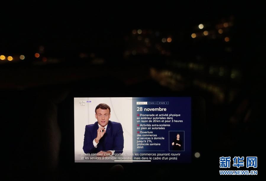 這是11月24日在法國巴黎拍攝的法國總統(tǒng)馬克龍發(fā)表電視講話的直播畫面,畫面中的字幕顯示法國擬從11月28日起,實(shí)施第一階段“解封”及相關(guān)措施。