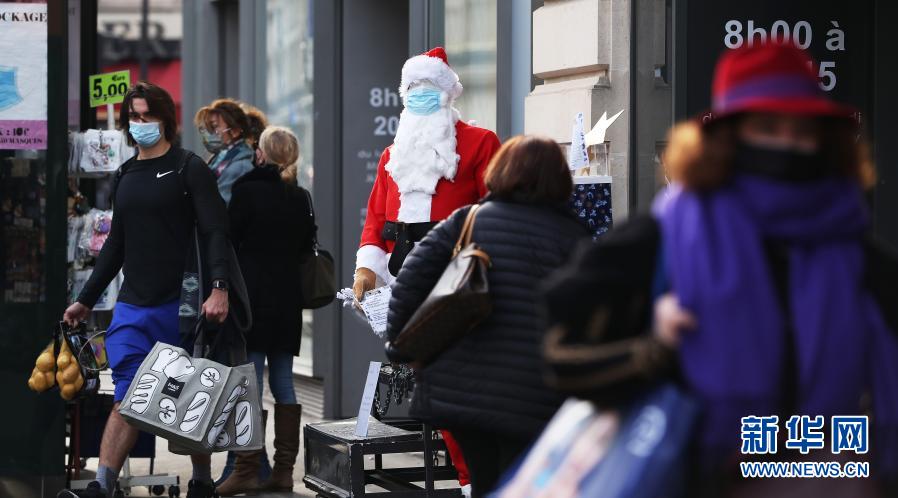 11月25日,人們從法國巴黎一家超市外戴口罩的圣誕老人模特旁走過。法國總統馬克龍24日發表電視講話說,鑒于法國第二波新冠疫情高峰已經過去,計劃從11月28日起分三個階段解除封禁措施。新華社記者 高靜 攝