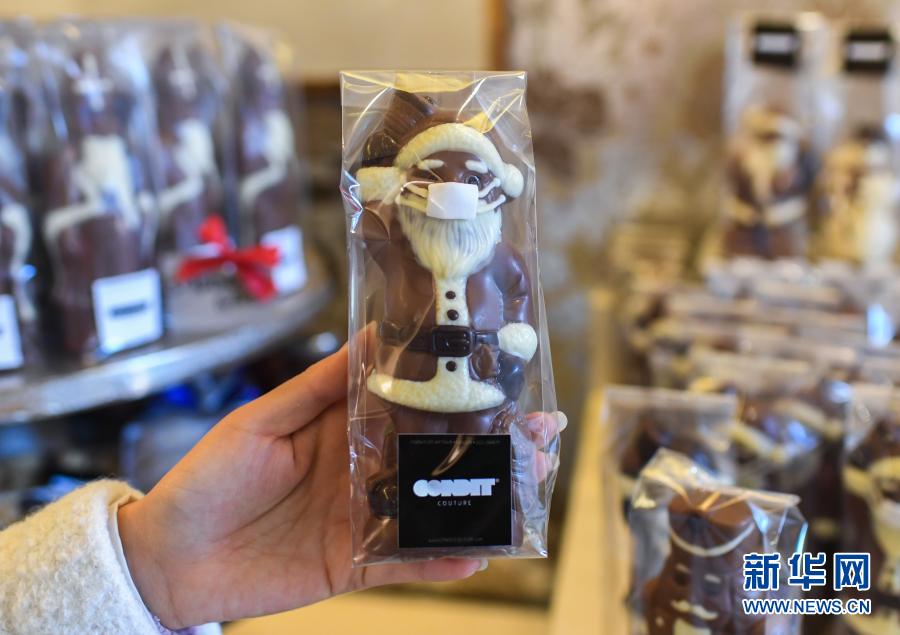 這是11月25日在德國法蘭克福一家糕點店內拍攝的戴口罩的圣誕老人造型巧克力。新華社記者逯陽攝