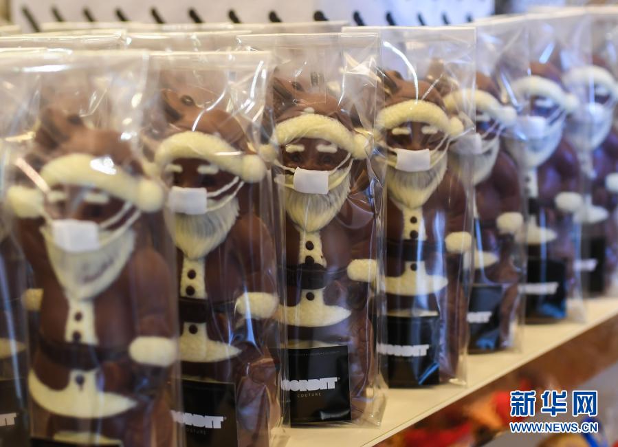 這是11月25日在德國法蘭克福一家糕點店內拍攝的戴口罩的圣誕老人造型巧克力。新華社記者逯陽攝