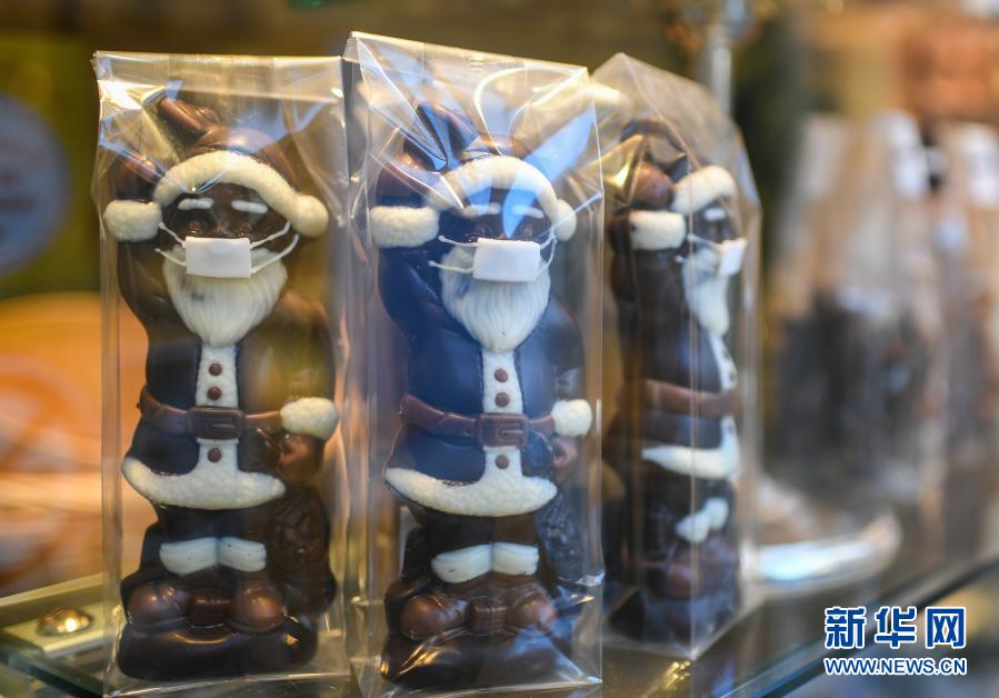 這是11月25日在德國法蘭克福一家糕點店內拍攝的戴口罩的圣誕老人造型巧克力。新華社記者逯陽攝
