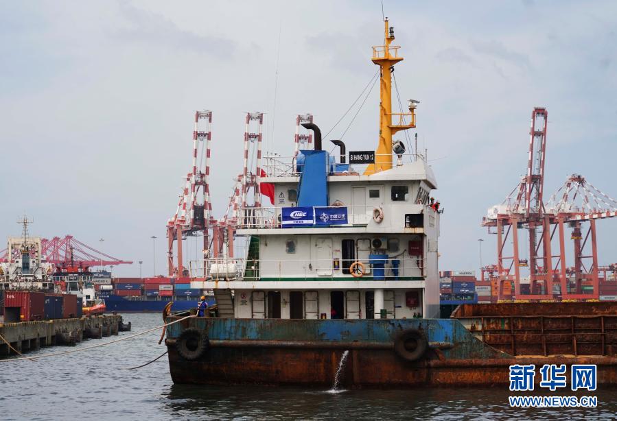 12月1日,在斯里蘭卡科倫坡港賈亞集裝箱碼頭,一艘工程船停泊在水面上。1日,斯里蘭卡科倫坡港賈亞集裝箱碼頭的一艘工程船上,挖掘機緩慢鏟出第一斗泥,標志著由中國港灣工程有限責任公司(中國港灣)承建的賈亞碼頭擴建項目正式開工,預計工期20個月。新華社記者 唐璐 攝