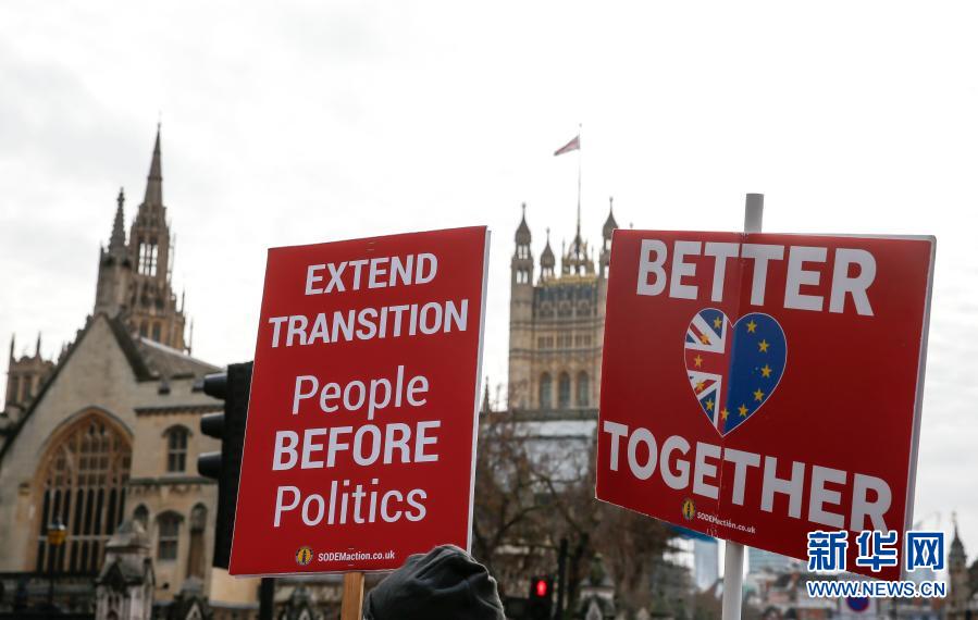 12月9日,反對“脫歐”的示威者手舉標語牌站在英國倫敦議會大廈外。 當日,英國首相約翰遜前往布魯塞爾與歐盟委員會主席馮德萊恩進行會晤,雙方將為推動以貿易協議為核心的未來關系談判做最后努力。 新華社記者韓巖攝