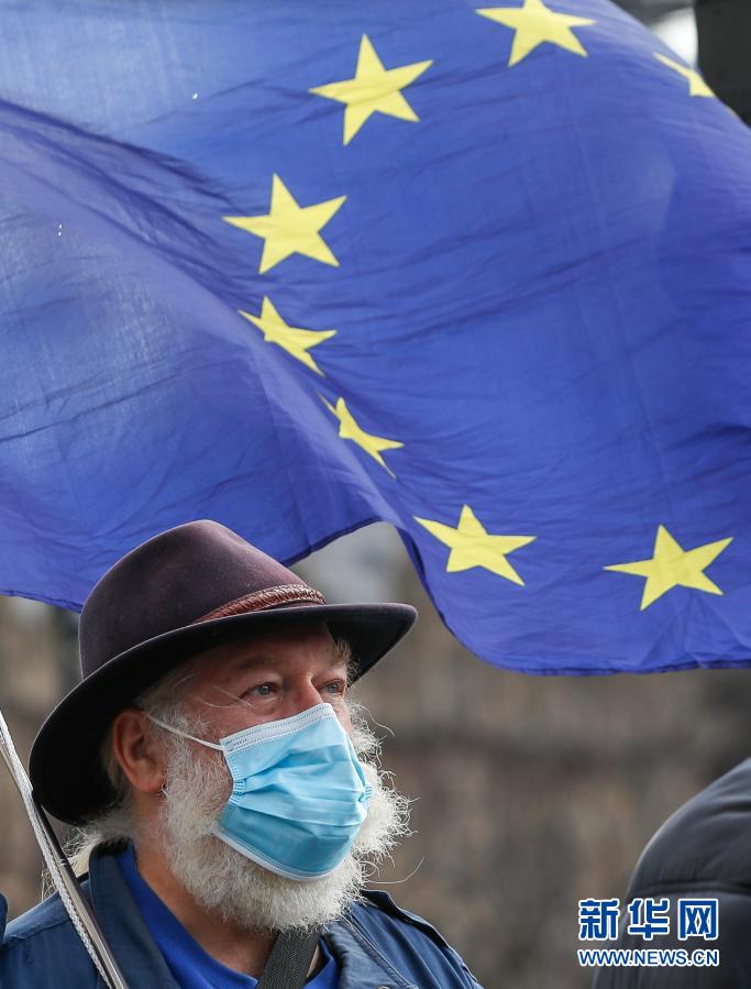 12月9日,反對“脫歐”的示威者站在英國倫敦議會大廈外。 當日,英國首相約翰遜前往布魯塞爾與歐盟委員會主席馮德萊恩進行會晤,雙方將為推動以貿易協議為核心的未來關系談判做最后努力。 新華社記者韓巖攝
