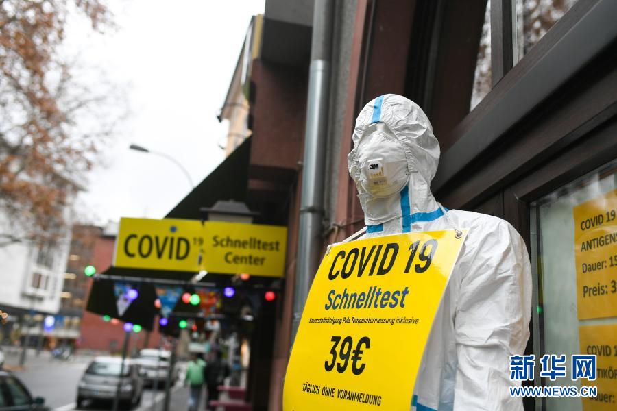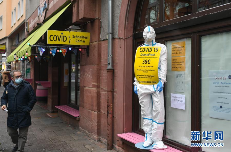 德國法蘭克福一處新冠病毒檢測中心外的著防護服的人型模特(1月6日攝)。 德國疾控機構羅伯特·科赫研究所5日公布的疫情數據顯示,截至當天零時,德國新增新冠確診病例11897例,累計確診1787410例;新增死亡病例944例,累計死亡35518例。德國聯邦和各州政府5日達成新協議,將目前實行的新冠防疫措施延長至1月31日,并將限制疫情嚴重地區居民的出行范圍。 新華社記者 逯陽 攝