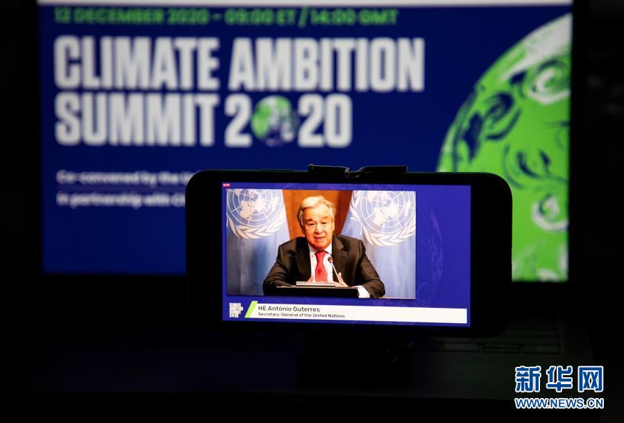 這是2020年12月12日在美國紐約拍攝的聯合國秘書長古特雷斯在氣候雄心峰會上通過視頻發表講話的屏幕畫面。氣候雄心峰會由聯合國及有關國家倡議舉辦,旨在紀念《巴黎協定》達成五周年,進一步動員國際社會強化氣候行動,推進多邊進程。 新華社記者 王迎 攝 |